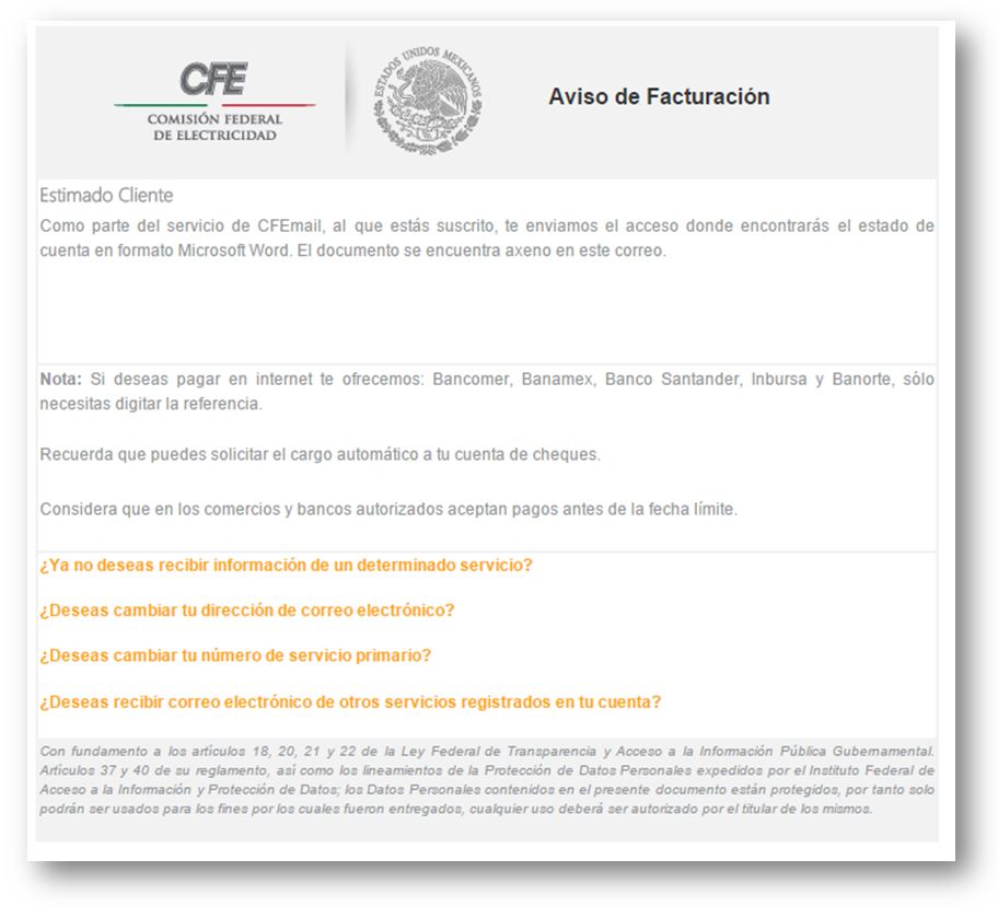 El documento de Word es enviado como anexo por medio de un correo electrónico que pretende engañar al usuario haciéndole creer que ha recibido su estado de cuenta o factura relacionado al servicio que brindado por la Comisión Federal de Electricidad (CFE).