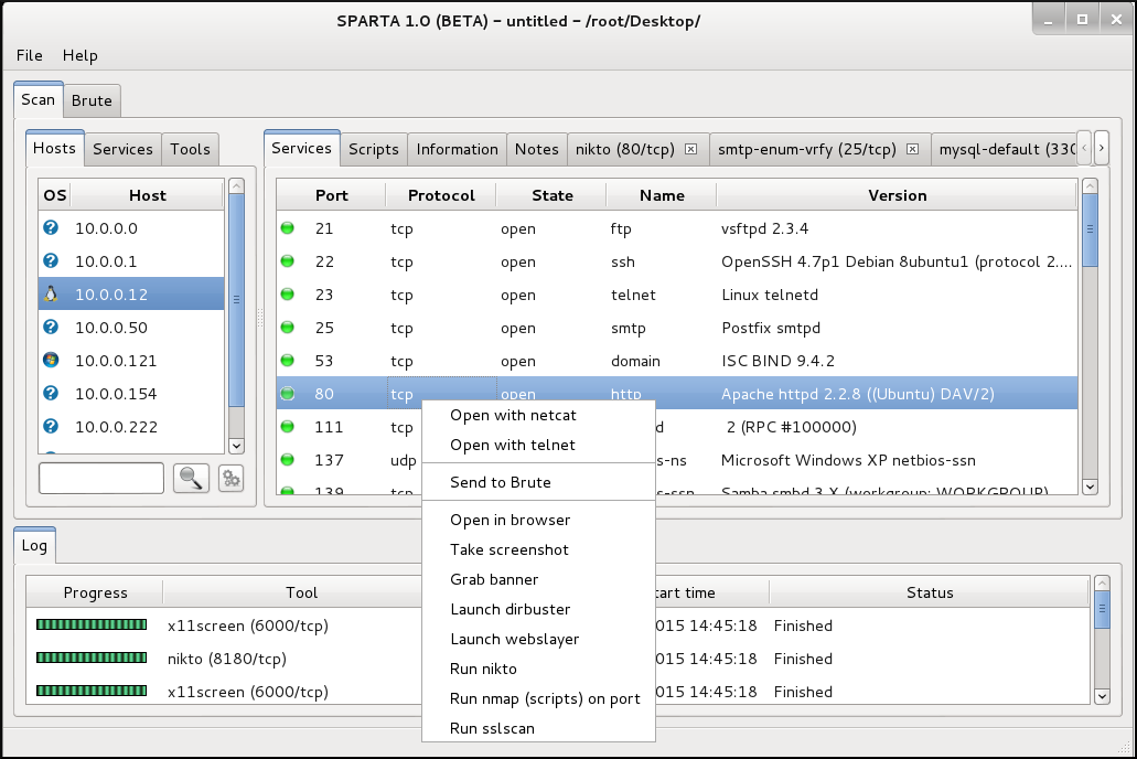 - Menú contextual configurable para cada servicio. Es posible configurar los comandos requeridos para cada servicio descubierto. Cualquier herramienta que se puede ejecutar desde una terminal, se puede ejecutar desde SPARTA.